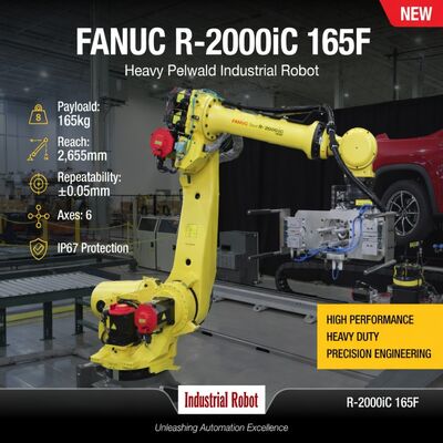 The Fanuc R-2000iC/165F is a 6-axis heavy-duty industrial robot with 165 kg payload and 2655 mm reach. It belongs to the long-running R-2000iC series, known for its slim wrist, high stiffness and excellent cycle times. It is one of the most widely installed robots in automotive spot welding lines worldwide, but also commonly used for heavy material handling, palletizing and machine tending.